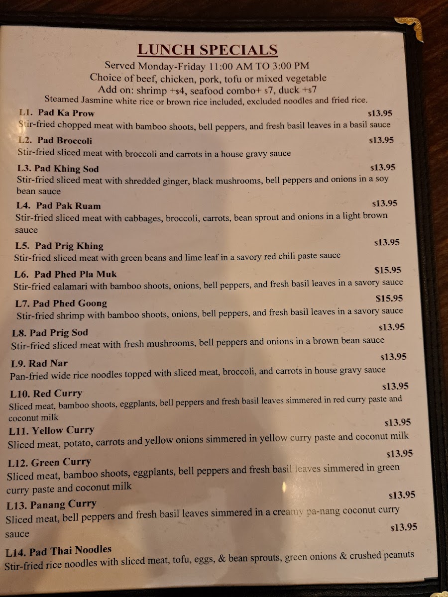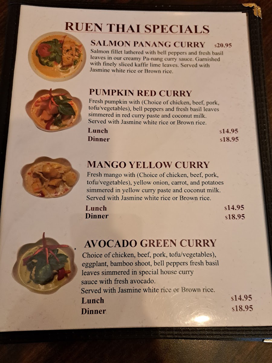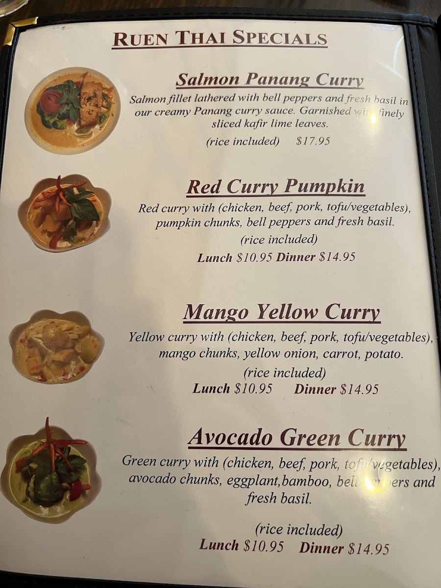 Red curry with (chicken, beef, pork, tofu or vegetables), pumpkin chunks, bell peppers and fresh basil. (rice included).